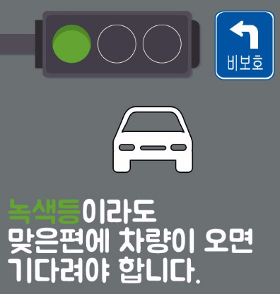 그러나 비보호 좌회전에서는 직진이 우선이기 때문에 맞은편에 직진차량이 오면 멈춰야 합니다