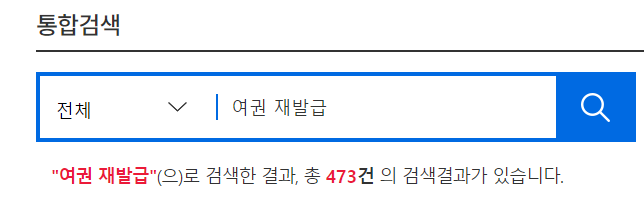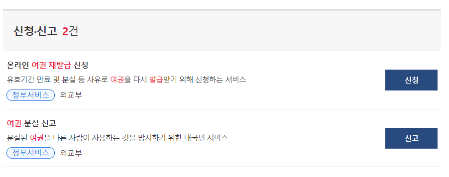 첫 번째, 정부 24 사이트에서 여권 재발급을 검색한 후 클릭합니다