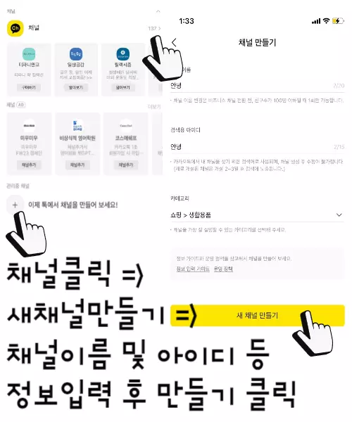 모바일은 카카오톡에 들어가신 후 채널메뉴를 클릭하여 들어간 후 채널메뉴에서 새 채널 만들기를 하여 만들면 됩니다